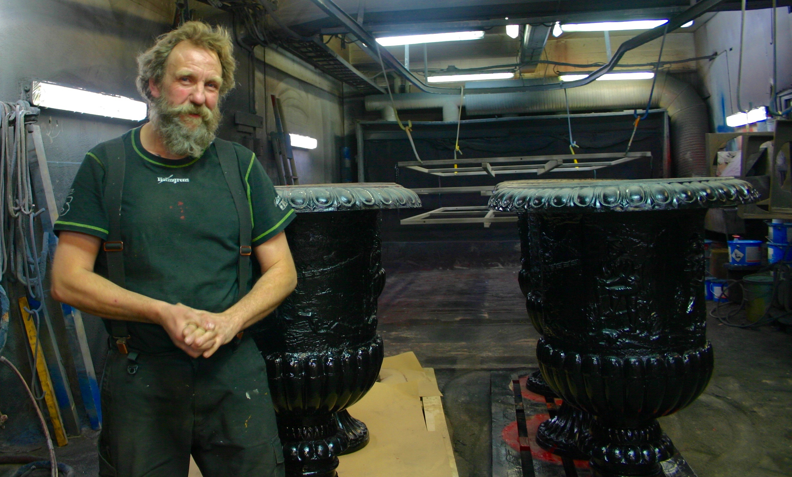 Sex maffiga gjutjärnsurnor från ett närliggande sörmländskt gods är klara för slutlackering innan leverans.